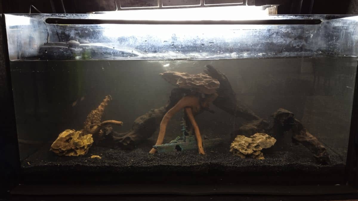 Összeférhetetlen módon két kisebb fátyolfarkú aranyhal és két felnőtt, illetve szintén két, éppen cseperedő fekete molli volt még az akvárium lakója. Mint kiderült, a karbantartásokat kb. félévente végezték, s ilyenkor a teljes talajt kimosták.